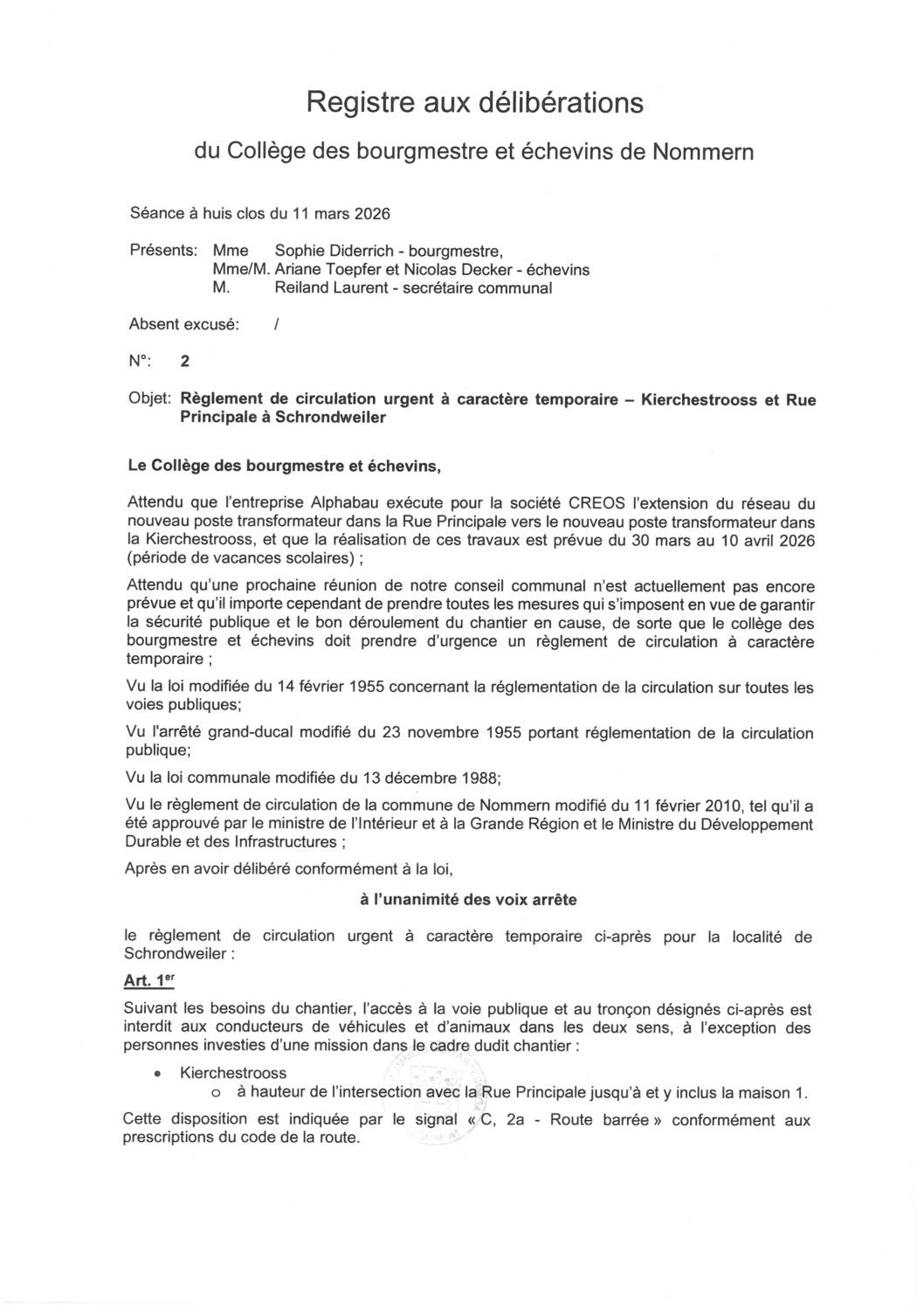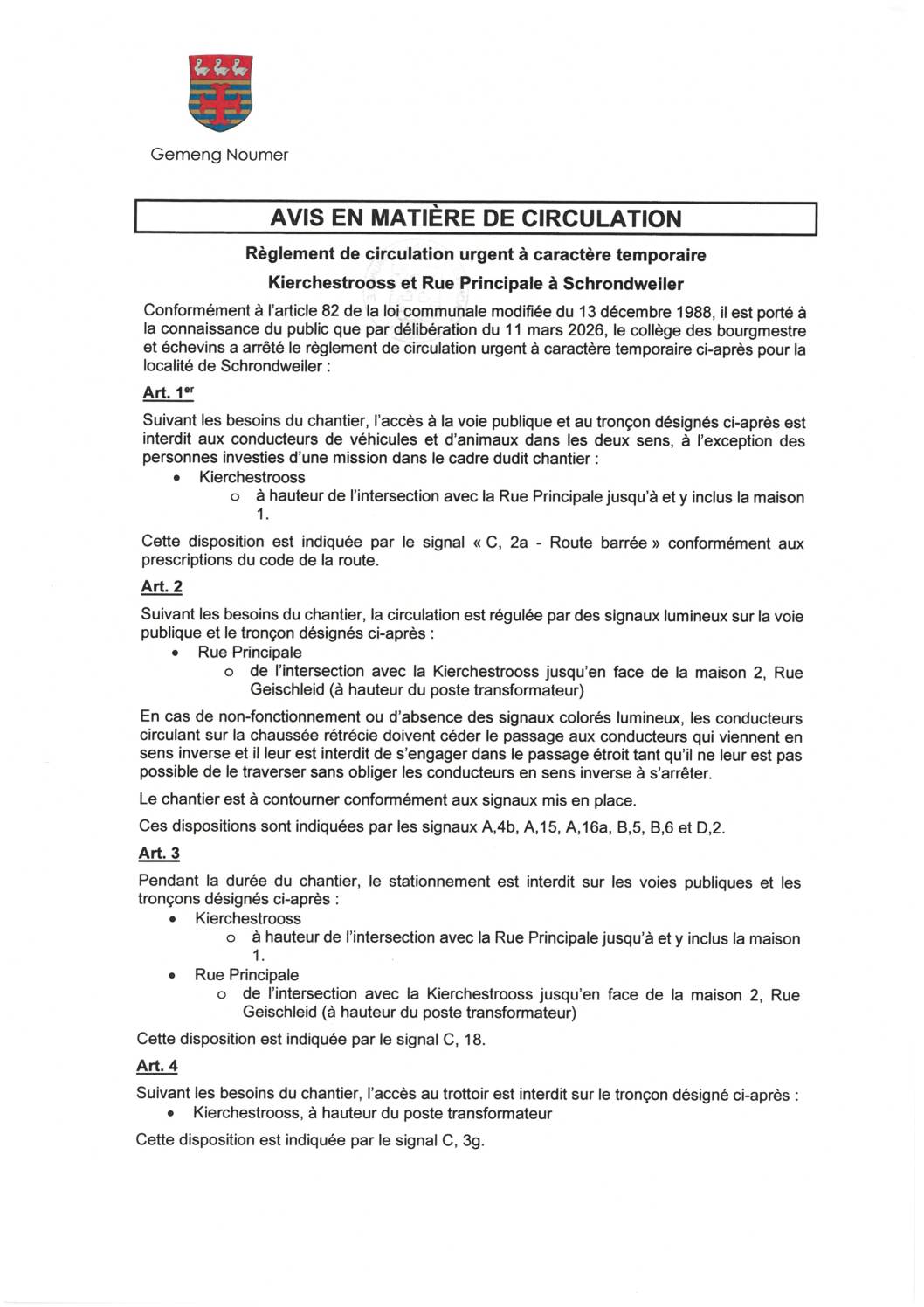 Vum 30. Mäerz bis den 10. Abrëll 2026 ass d’Kierchestrooss tëscht der Rue Principale an der Hausnummer 1 inklusiv fir de Verkéier gespaart.